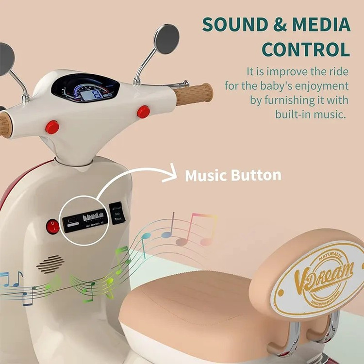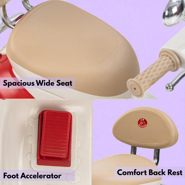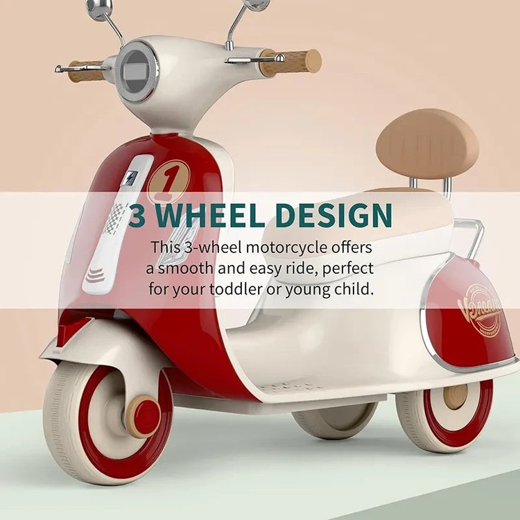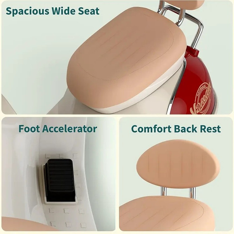 موتور شارژی وسپا با تکیهگاه، انتخابی بسیار مناسب برای کودکان است که میخواهند تجربهای شبیهسازیشده از موتورسواری داشته باشند. طراحی این موتور بهگونهای انجام شده تا شباهت زیادی به موتور واقعی برند وسپا داشته باشد، با صندلی چرمی با تکیهگاه، کنترل گاز و ترمز، و دو چرخ تعادل برای محافظت.