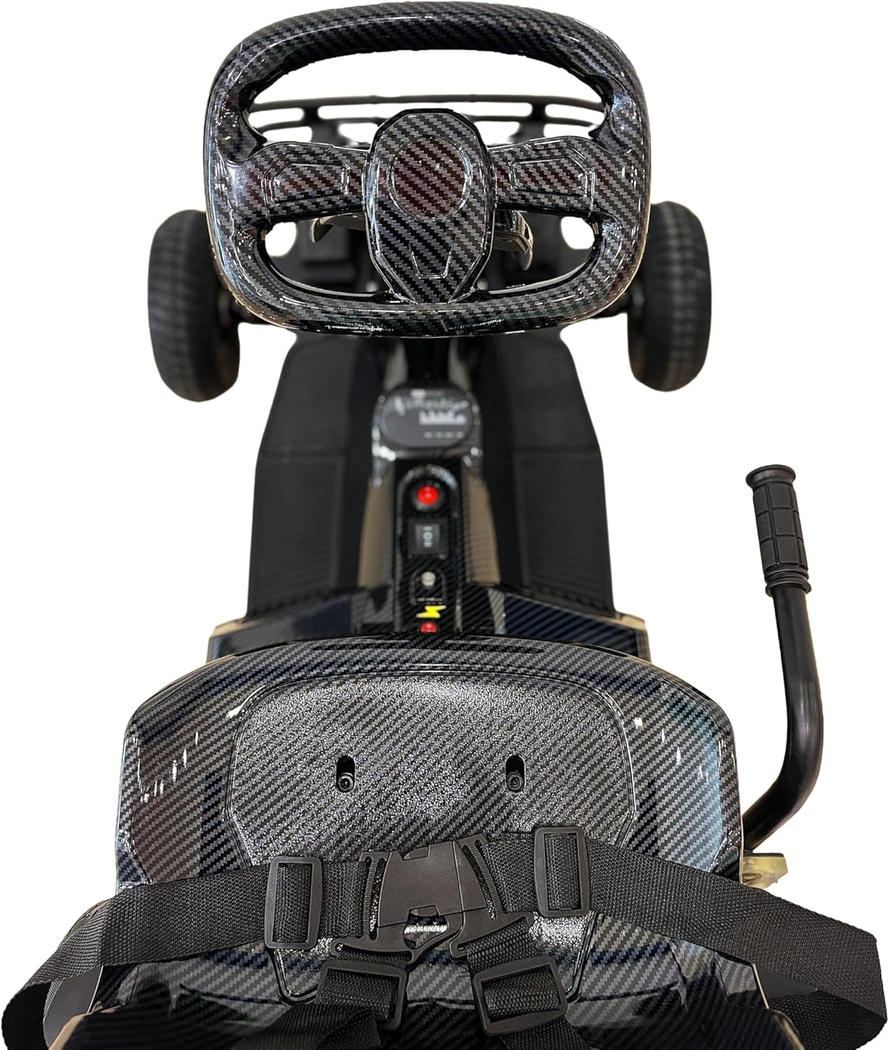 این کارتینگ با الهام از خودروهای اسپرت برتر دنیا طراحی شده است. بدنه مشکی براق با طرح کربن فیبر (Carbon-fibre look) حس یک وسیله نقلیه پیشرفته و گرانقیمت را القا میکند. این طراحی نهتنها برای کودکان جذاب است، بلکه برای والدینی که به کیفیت و استایل اهمیت میدهند نیز رضایتبخش خواهد بود.